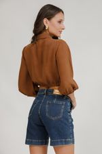 Bermuda feminina jeans de modelagem média com etiqueta de metal na barra. Corte social, acabamento refinado e a sofisticação moderna que só a Jeandarrot traduz.