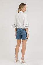 Bermuda feminina jeans de modelagem tradicional com detalhe em metal nos bolsos frontal e traseiro. Clássica, moderna e cheia do charme Jeandarrot.