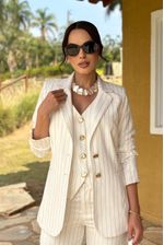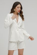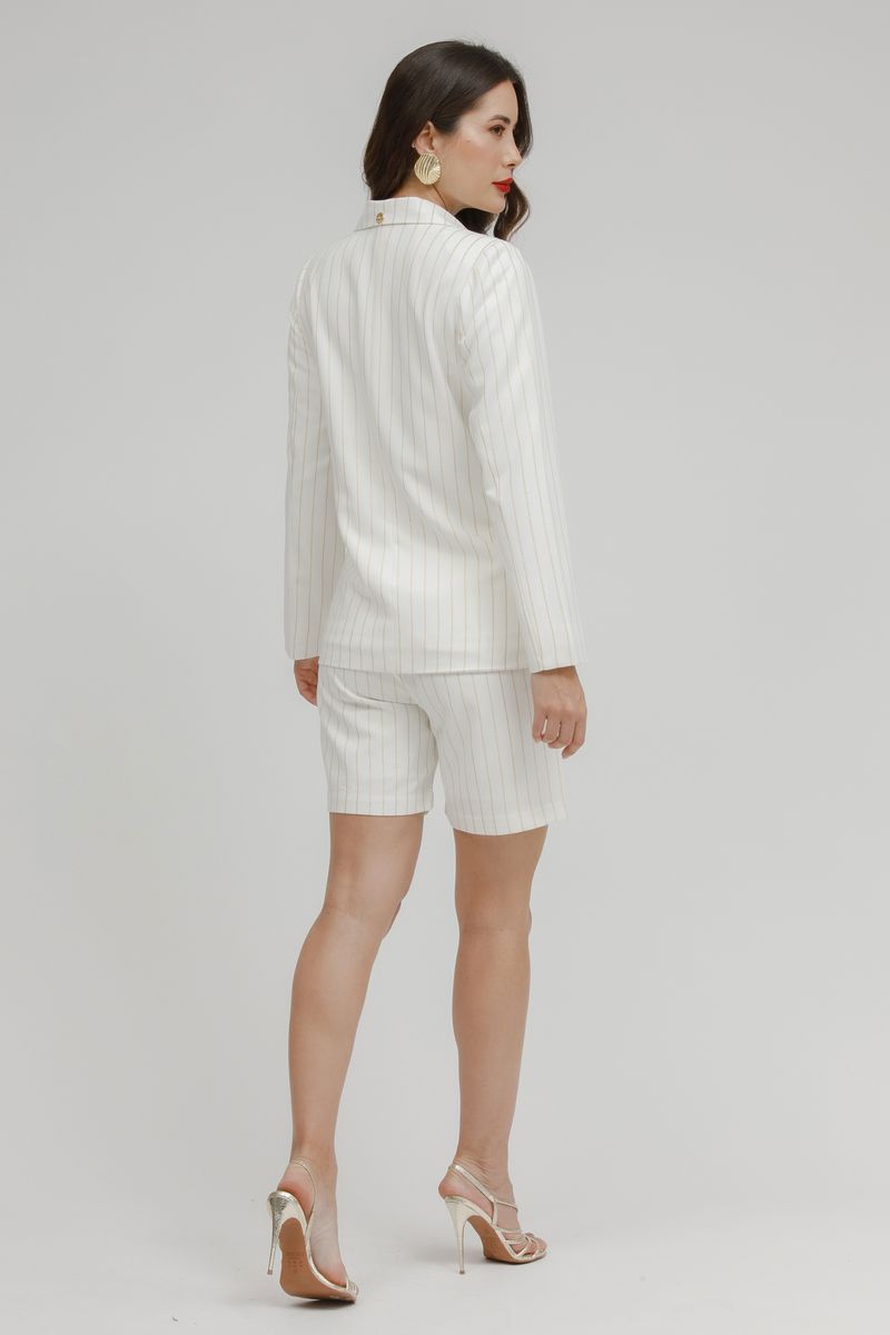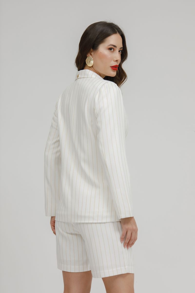 Blazer feminino forrado com risca de giz dourada, corte estruturado e elegante, perfeito para produções sofisticadas e cheias de estilo.