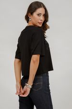 A blusa cropped de malha tricot une conforto e estilo com sua modelagem soltinha, perfeita para um visual leve e despojado. Os detalhes em transfer e metal adicionam um toque moderno e sofisticado, deixando a peça com brilho na medida certa.