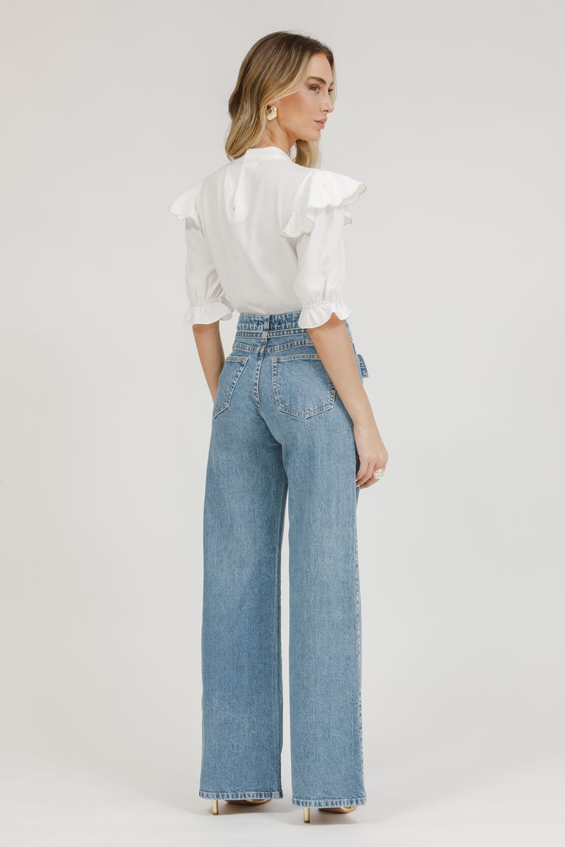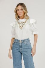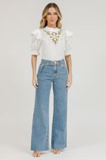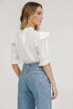 Blusa de viscolinho com elástico nas mangas, babados e bordado richelieu. Design leve e atemporal que une delicadeza e sofisticação.