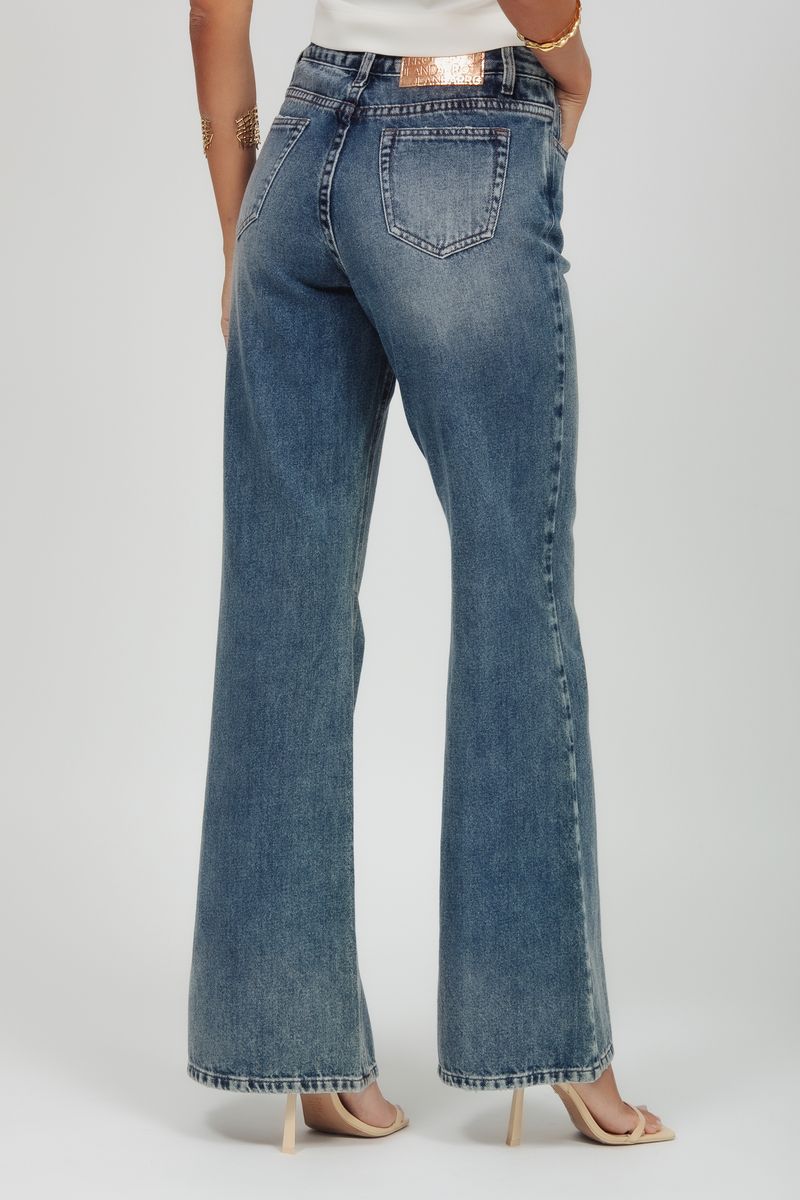 Calça Jana tem como características cós acima do umbigo e modelagem que se amplia a partir do joelho.