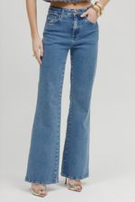 Calça Jana tem como características cós acima do umbigo e modelagem que se amplia a parti do joelho.