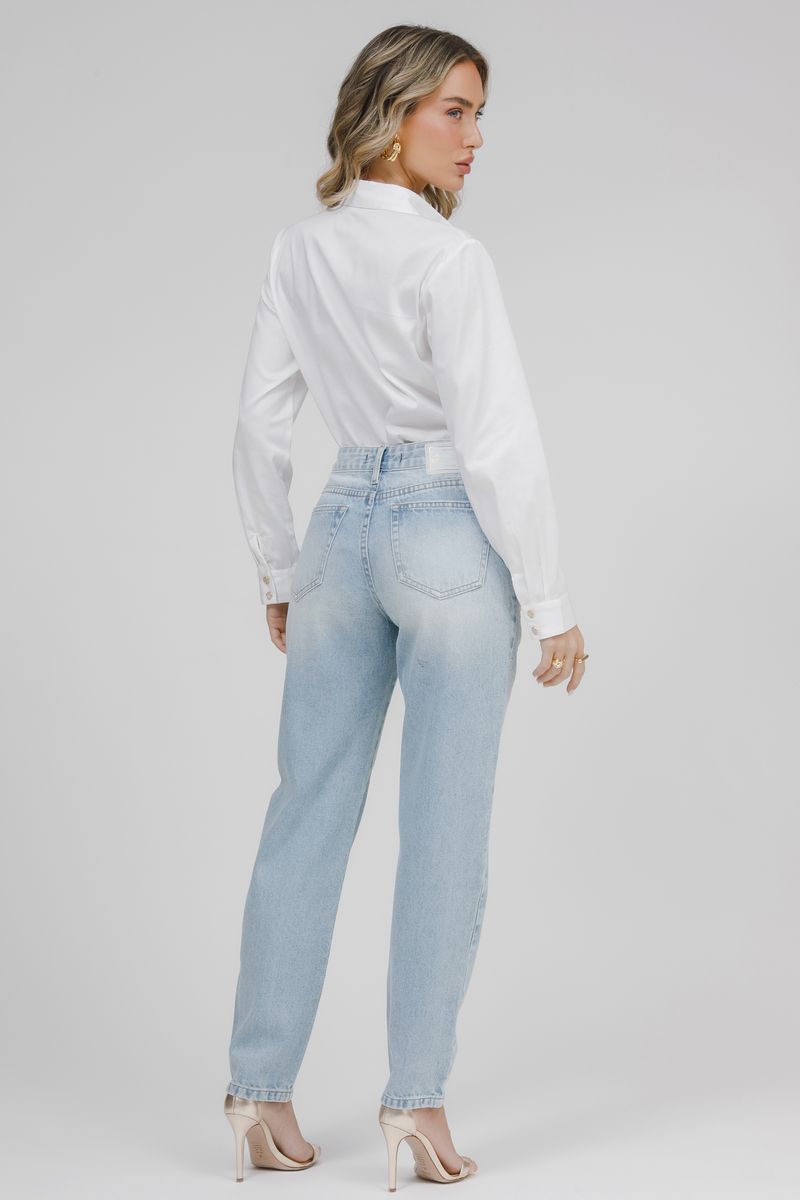 Calça Lorena tem cós acima do umbigo, com modelagem mais solta, não aperta em lugar nenhum. E a clássica calça mom jeans, cintura alta, corte reto com um leve afunilado próximo ao tornozelo.
