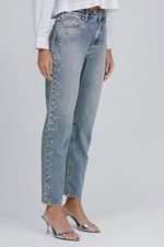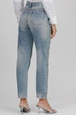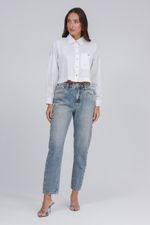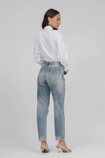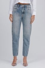 Calça Lorena tem cós acima do umbigo, com modelagem mais solta, não aperta em lugar nenhum. E a clássica calça mom jeans, cintura alta, corte reto com um leve afunilado próximo ao tornozelo.