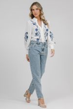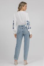 Calça Lorena tem cós acima do umbigo, com modelagem mais solta, não aperta em lugar nenhum. E a clássica calça mom jenas, cintura alta, corte reto com um leve afunilado próximo ao tornozelo.