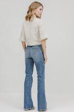 A calça jeans Sofia flare valoriza a silhueta com seu cós pouco abaixo do umbigo, justa nas coxas e joelhos afunilados que se ampliam a partir do joelho, garantindo um caimento elegante e alongado. Com 86cm de entrepernas, traz como diferencial uma etiqueta artesanal com bordado e aplicação de transfer, que traduz exclusividade e cuidado nos detalhes.