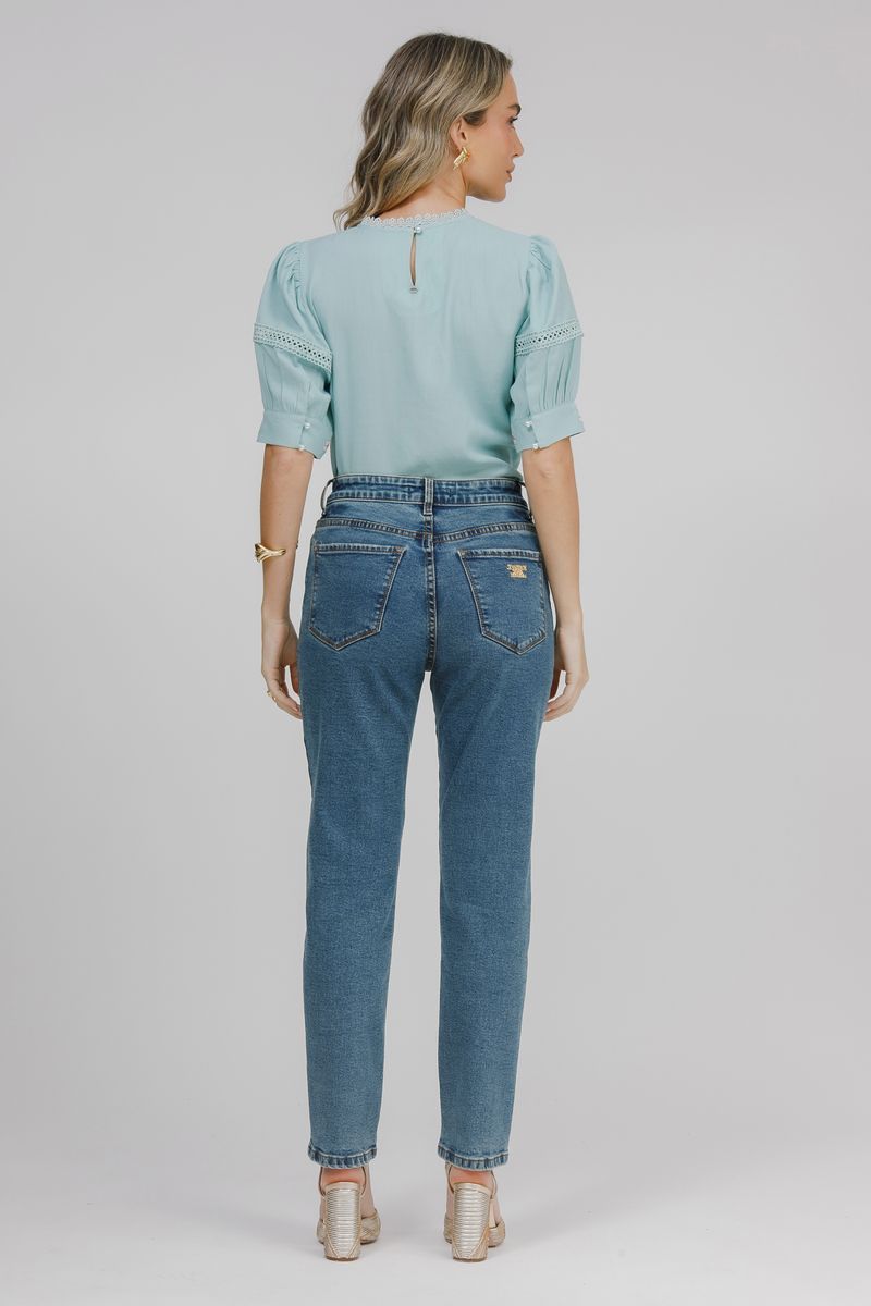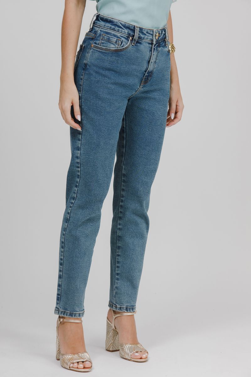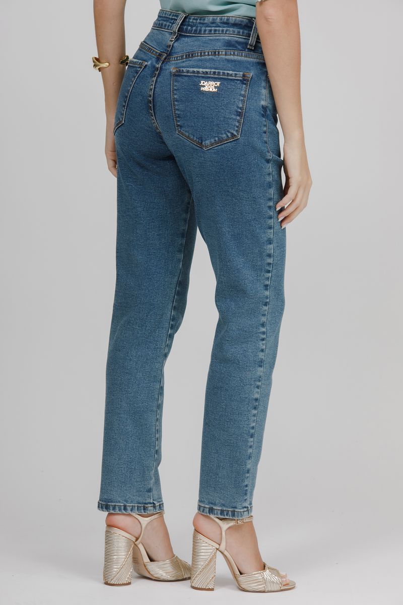 Modelagem com mais conforto no quadril e coxas, cintura alta, com folga nas pernas.