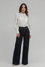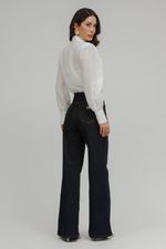 Cós acima do umbigo, ela tem um caimento mais largo que segue até a barra. combina características de uma calça reta com uma pantalona.