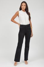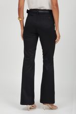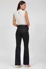 Calça bootcut tem a modelagem ajustada na altura das coxas e abertura sútil abaixo dos joelhos.