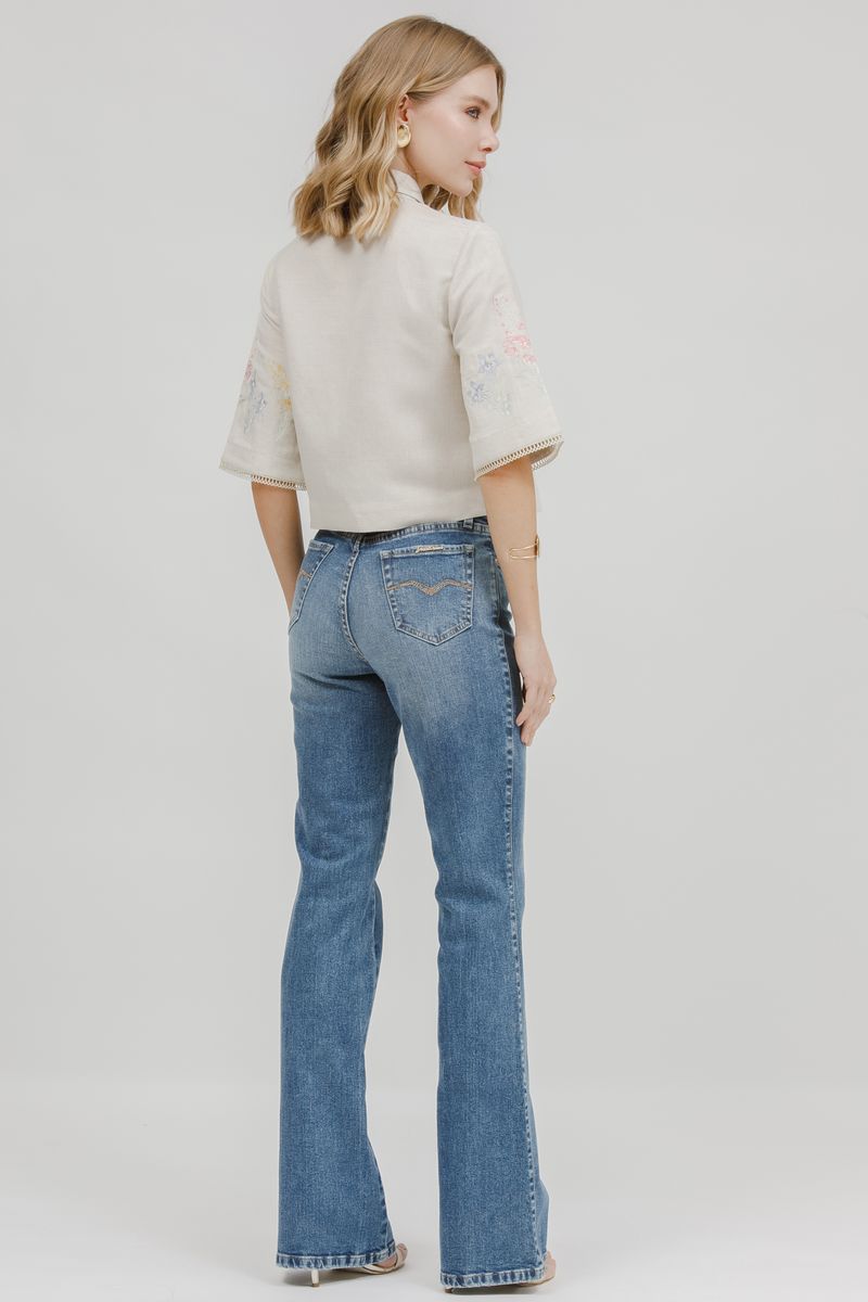 Delicadeza e charme em cada detalhe. Esta camisa cropped é confeccionada em tecido leve e possui mangas com bordado de flores e acabamento em renda bico, que trazem um toque romântico e sofisticado à peça. Ideal para compor looks femininos e elegantes com um toque artesanal.