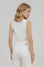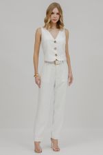 Colete feminino de alfaiataria com design moderno e corte impecável. O destaque fica por conta dos botões grandes dourados e do formato assimétrico, que trazem sofisticação e estilo único à peça.