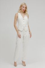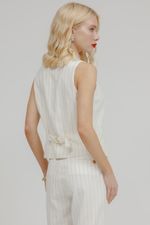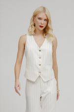 Colete feminino de alfaiataria com risca de giz dourada, forro interno e botões dourados que trazem sofisticação e modernidade ao look.