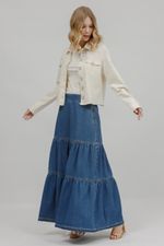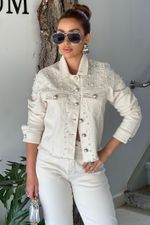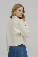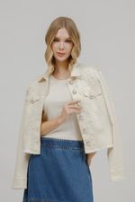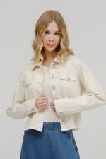 Cheia de personalidade, a jaqueta de sarja traz manga longa, fechamento com botão de pérola e aplicação de transfer e pérolas por toda a peça, criando um visual elegante com toque fashionista. A barra desfiada finaliza o modelo com um charme despojado, ideal para elevar produções casuais com estilo e sofisticação.