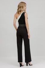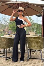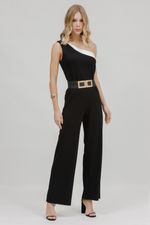Macacão longo de malha em preto e branco, modelo ombro único, que une sofisticação e conforto. Acompanha cinto para marcar a cintura e valorizar a silhueta, ideal para produções modernas e elegantes.