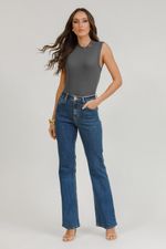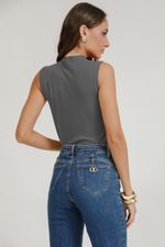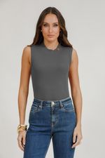 Regata de malha com gola alta e detalhe em metal na gola. Minimalista e sofisticada, valoriza o visual com elegância e toque contemporâneo.