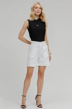 A regata feminina de lurex é pura sofisticação! Com gola alta e detalhe em metal no peito, garante brilho e modernidade em qualquer produção, perfeita para looks elegantes do dia à noite.