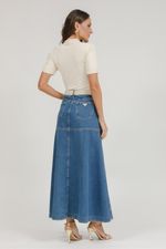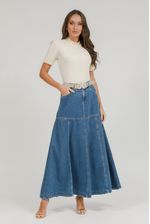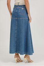 Saia jeans longa com nesgas que ampliam o movimento e valorizam o caimento, acompanhada de cinto para um visual moderno e elegante.