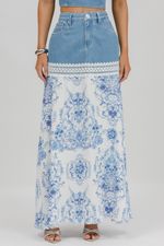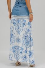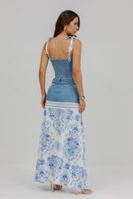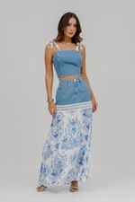 Set jeans feminino encantador: top com alças em tecido e saia longa com barra estampada, unindo frescor, leveza e estilo em um só look.