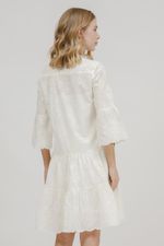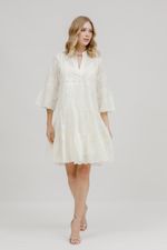 Delicado e cheio de charme, este vestido curto conquista com suas mangas em voil bordado, que adicionam leveza e romantismo ao visual. Um modelo que une conforto e elegância, ideal para ocasiões especiais ou para transformar o dia a dia com um toque sofisticado.
