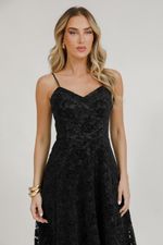 Vestido midi de alça fina com modelagem godê que cria movimento leve e elegante. Confeccionado em renda de camurça e totalmente forrado, revela um visual delicado e sofisticado, digno de princesa.