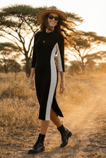Vestido midi de malha com manga 3/4 e fenda lateral. Conforto e elegância na medida certa para um look feminino e moderno.