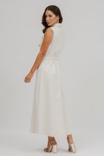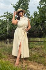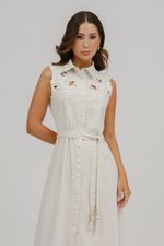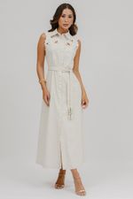 Vestido longo de sarja cavado, com caimento imponente e delicadeza nos detalhes. Os bordados combinados com pérolas trazem um toque artesanal e sofisticado, transformando a peça em um verdadeiro destaque para ocasiões especiais.